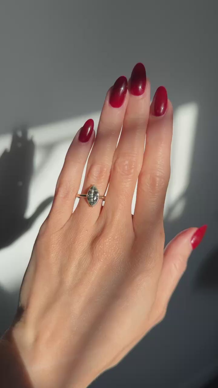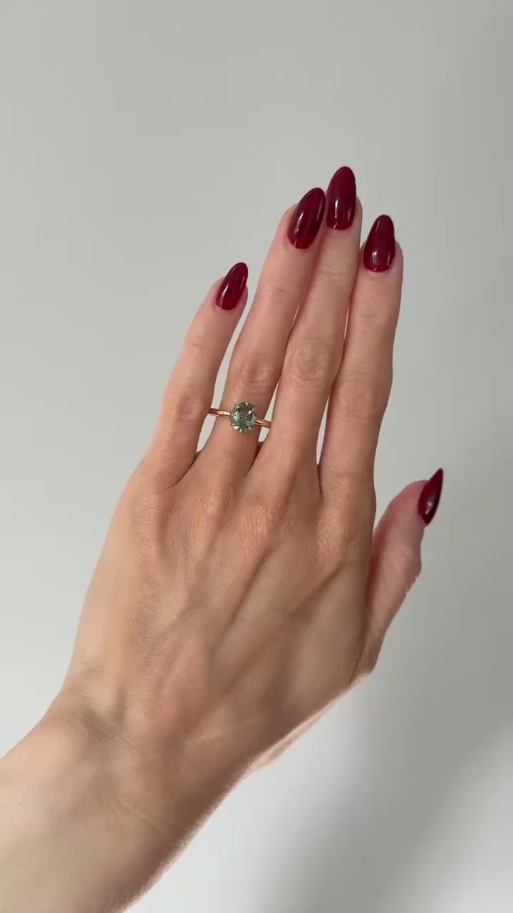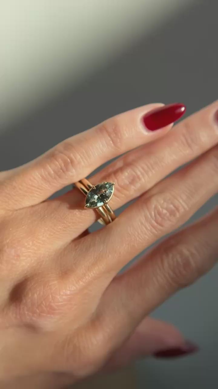 Meet Atlas, our signature compass prong floating engagement ring set with a precision cut natural light green marquise sapphire. The four talon claws are oriented to the points of a compass while the floating setting allows another band to sit flush up beside. Designed and made in a small Toronto workshop (not a factory). The half round band is 2 mm wide.