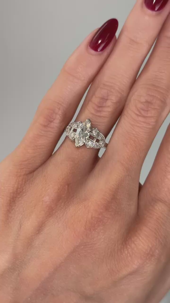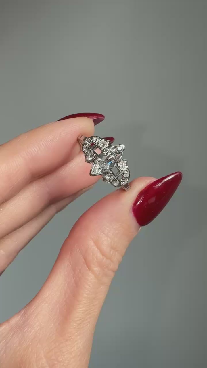 Charming true vintage art deco engagement ring in platinum, set with a central marquise cut natural diamonds and a surround of 10 small round diamonds.
